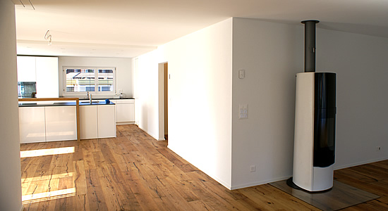 heutige Standards angapasst. So wird eine Bodenheizung eingebracht, das sehr enge Entree vergrössert sowie die geschlossene Küche zum Wohnraum hin geöffnet. Auch die Nasszellen werden
