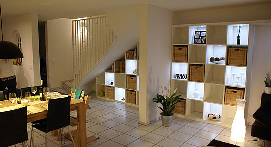 So liegt unter der Treppe ein Stauraum, der für nichts richtig genutzt werden konnte, aber dennoch sehr prominent im Wohnraum liegt, zusätzlich unterteilt durch eine Wandscheibe.